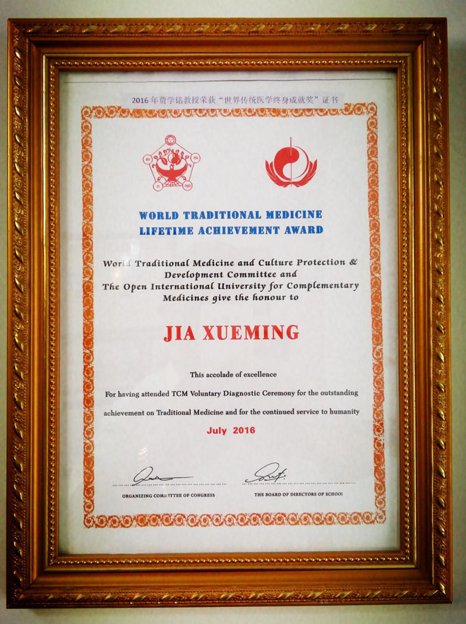 贾学铭教授2016年荣获“世界传统医学终身成就奖”证书