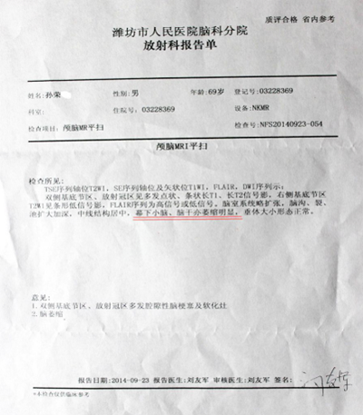 山东潍坊吉缘堂抗衰老中医药研究所 中国传统医药是能够促进世界人民更加健康。中国传统医学应是保障世界人民健康的主要医学体系,她能够预防疾病和治疗疾病,更没有副作用,不会对人体产生伤害和药物残留,是医学的魁宝,是人类的魁宝,应当勇于发扬!过去的几年我在山东潍坊吉缘堂抗衰老中医药研究所(简称:吉缘堂),认真研究传统医学,用中医中药认真的进行临床研究和临床使用,运用传统中医药使脑细胞再生长,对脑萎缩、阿尔茨海默病(老年痴呆症)等脑科疾病的临床验证,达到了控制和治愈的效果。突破了以往医学界普遍认为脑细胞不能再生长,脑萎缩和阿尔茨海默病不能治愈的不正确观点。选出两个典型病例给以简单介绍如下: 典型病例一:脑细胞再生长治愈小脑萎缩 患者:孙先生 , 男,69岁,患小脑萎缩20余年。于2014年9月23日初诊,即到医院做核磁共振(MRI)影像检查显示(指小脑部位内容):“幕下小脑、脑干亦萎缩明显”。治疗处理:给以纯中药配制胶囊口服,不使用其他任何药物等方法,经治疗2个月后,于2014年11月29日到医院再做核磁共振(MRI)进行复查,核磁共振(MRI)显示(指小脑部位内容):“幕下小脑未见异常信号”。经过治疗前后的核磁共振(MR)影像对比显示,纯中药治疗小脑萎缩是有明显的有效变化,患者症状消失,指鼻试验等活动均正常。 该患者同时患有多发性脑梗塞,在初诊2014年9月23日拍核磁共振(与小脑萎缩同一个片)拍片还显示有多发性脑梗塞,在治疗小脑萎缩的同时,即两个月后,第二次2014年11月29日拍核磁共振检查显示:多发性脑梗塞消失。这也证明了纯中药治愈多发性脑梗塞的作用也是非常有效的。 通过我们治疗的小脑萎缩典型病例,就可以证明,小脑萎缩是可以治疗并能够治愈的。