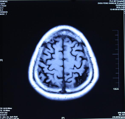 报告单1(治疗前) 报告单2(治疗后) 报告单1是孙先生治疗前, 2014年9月23日进行核磁共振(MRI)检查报告中检查所见:“幕下小脑、脑干亦萎缩明显”。报告单2是孙先生治疗后: 2014年11月29日用纯中药治疗2个月后,进行核磁共振(MRI)检查报告中检查所见:“幕下小脑未见异常信号”。临床症状明显消失。 典型病例二(影像比较):脑细胞再生长使脑组织增长 患者:周先生 男 76岁 退休干部,治疗前面无表情、意识不清,不能自己活动等。做核磁共振检查进行治疗前后比较如下: