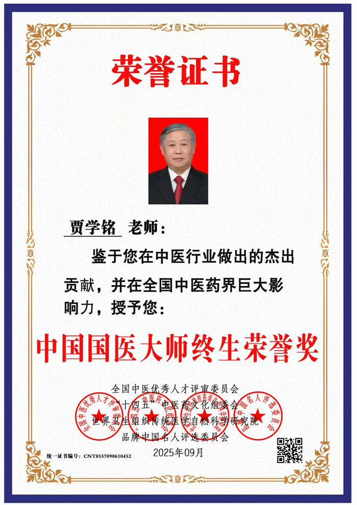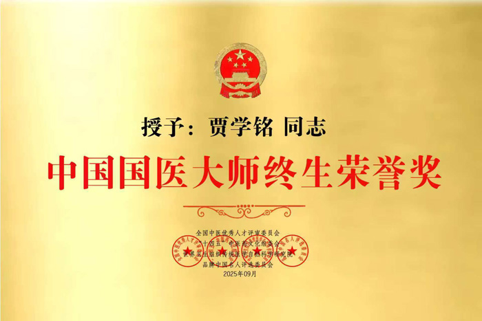 贾学铭国医大师、教授、主任医师被国家多个机构评定为:鉴于您在中医行业做出的杰出贡献,并在全国中医药届巨大影响力,颁发《中国国医大师终生荣誉奖》这是匾牌、证书。