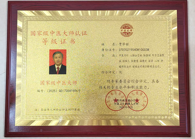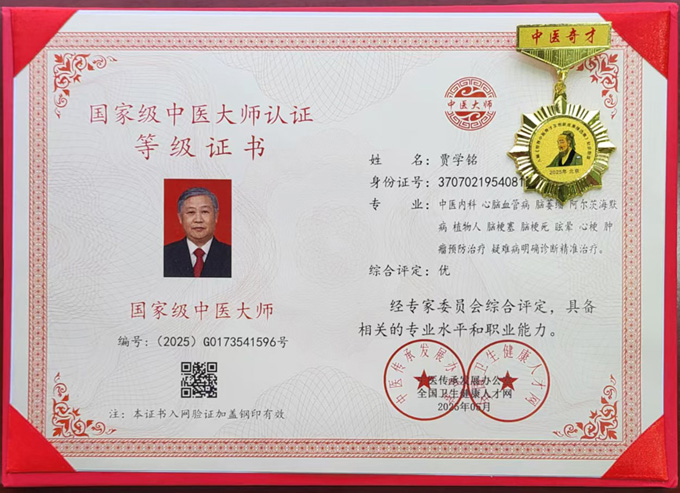 贾学铭教授被国家有关部门等级认证为:国家级中医大师。编号:(2026)G0173541596专业:中医内科 心脑血管病 脑萎缩 阿尔茨海默病 植物人 脑梗塞 脑梗死 眩晕 心梗 肿瘤预防治疗 疑难病明确诊断精准治疗。
